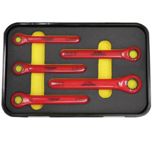 Bộ cờ lê đầu vòng tự động ( cờ lê bánh cóc ) cách điện Signet E82005 là bộ cờ lê đầu vòng (ring/gear wrench) cách điện chuyên dụng, được thiết kế cho kỹ thuật viên điện và bảo trì công nghiệp, giúp thao tác an toàn trong môi trường làm việc với điện áp cao