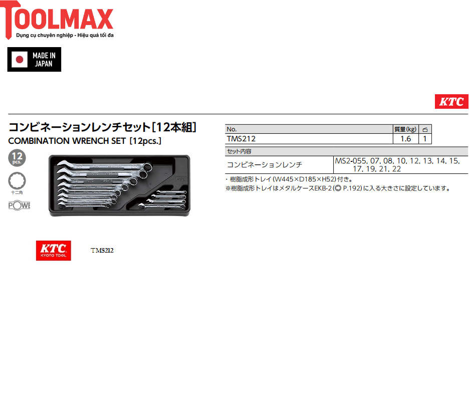 Bộ cờ lê vòng miệng KTC TMS212 là một trong những bộ cờ lê chất lượng cao bao gồm đầy đủ các loại khóa vòng miệng tiêu chuẩn từ 5.5mm đến 22mm của thương hiệu KTC: