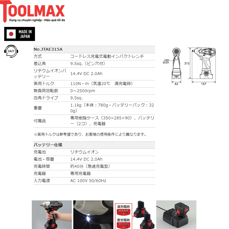 Thông số kỹ thuật súng vặn ốc dùng pin của KTC JTAE315A:Model: JTAE315A