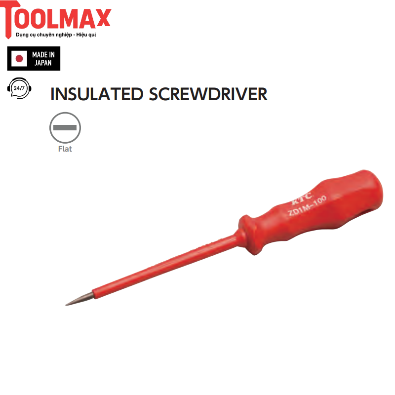 Sản phẩm đạt tiêu chuẩn IEC 60900:2004 đối với dụng cụ cầm tay cách điện dùng khi làm việc gần các bộ phận mang điện đến 1000V AC và 1500V DC. Tua vít dẹp cách điện KTC ZD1M-100 được thiết kế cách điện giúp tránh làm hỏng bảng điện, dây dẫn và các bộ phận khác phù hợp cho việc sửa chữa xe điện, các công việc liên qua đến sửa điện
